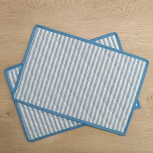 Le Tovagliette Americane “Miros” in tessuto 100% Cotone a righe colore Avio, perfette per aggiungere un tocco di eleganza alla tua colazione ma ideale anche per merende, spuntini e pranzi veloci. MARCA E MODELLO: – Tessitura Pezzoli – Tovagliette Americana MATERIALE: – 100% Cotone – Misure 33x50cm COLORE: – Come da foto
