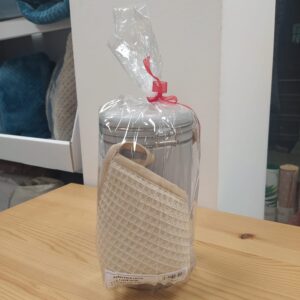Barattolo in Latta colore Bianco con scritta ” I Love Home” insieme a una Presina e una Lavetta a nido d’ape di colore Bianco in tessuto 100% Cotone,perfetto come idea regalo per le festività. MARCA E MODELLO: – Melangio – Barattolo + Presina + Lavetta MATERIALE: – 100% Cotone – Misure: Barattolo 11x20cm…