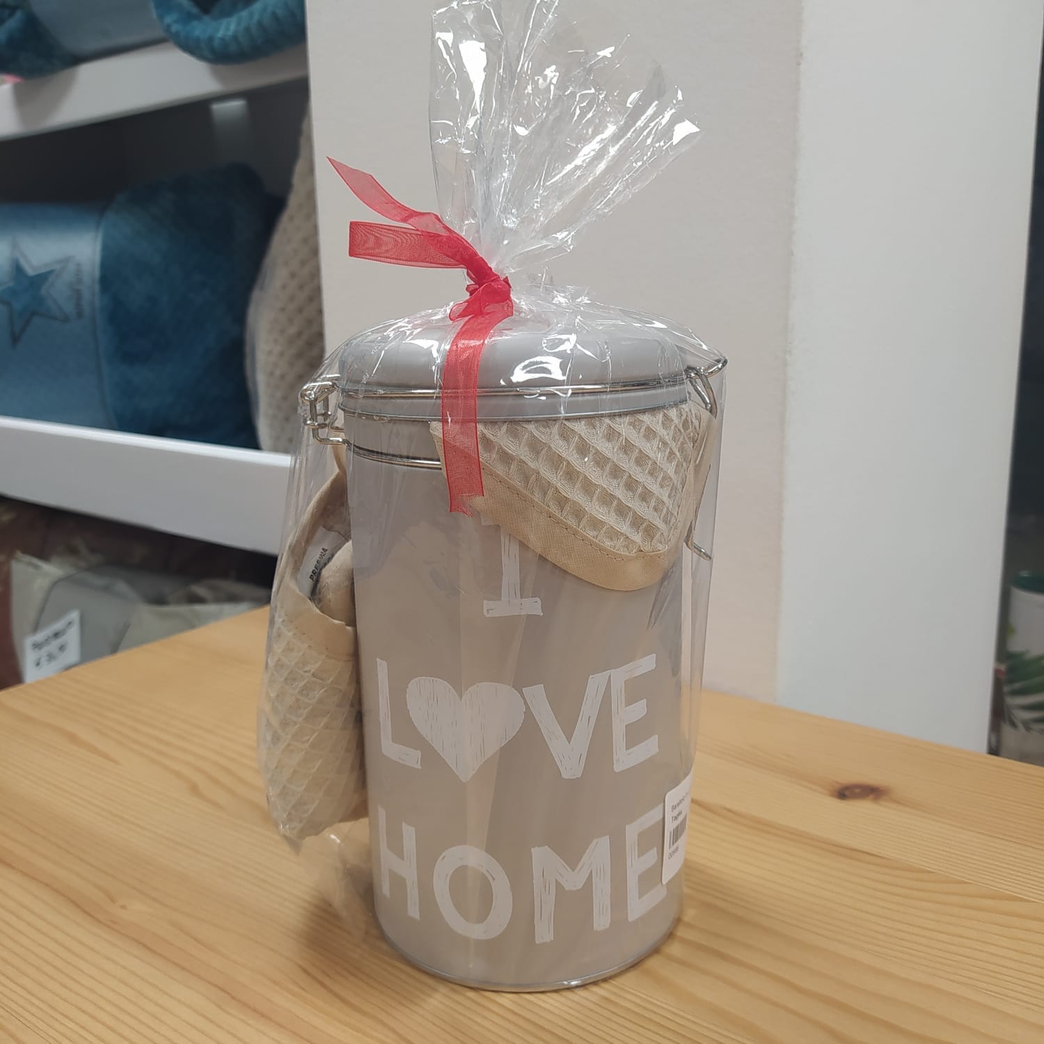 Barattolo in Latta colore Tortora con scritta ” I Love Home” insieme a una Presina e una Lavetta a nido d’ape di colore Tortora in tessuto 100% Cotone,perfetto come idea regalo per le festività.
