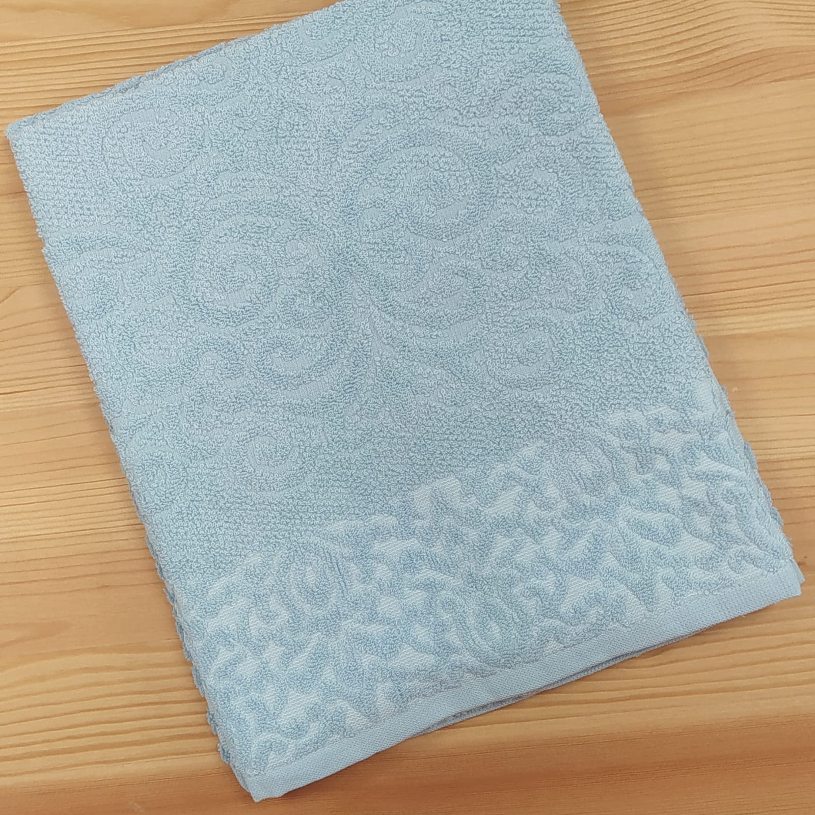 Coppia di Asciugamano da bagno “Emma”, composta da una salviette per il viso e una salviette per ospite, realizzata in morbida e delicata spugna 100% cotone, di colore Azzurro, con una raffinata lavorazione in arabesque.