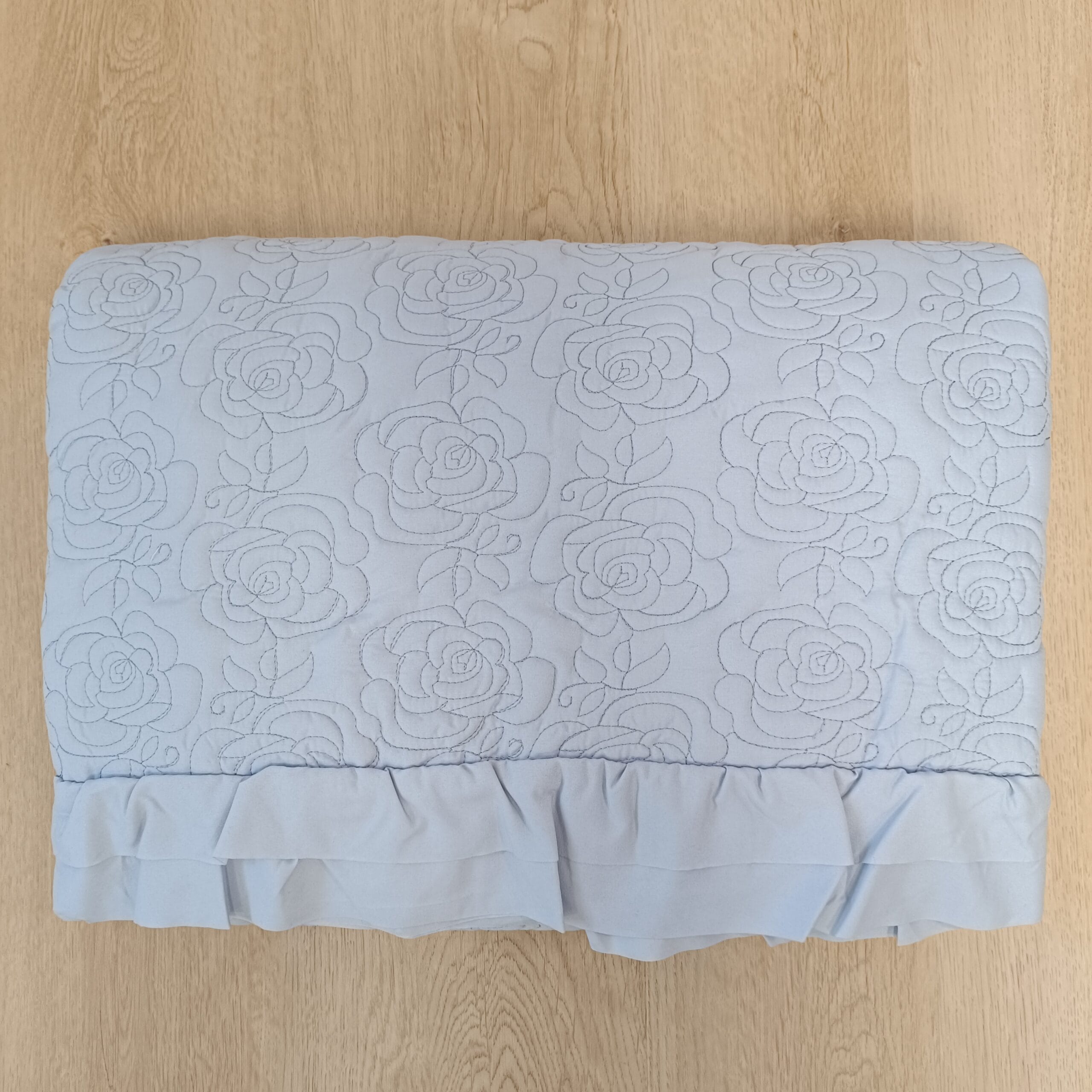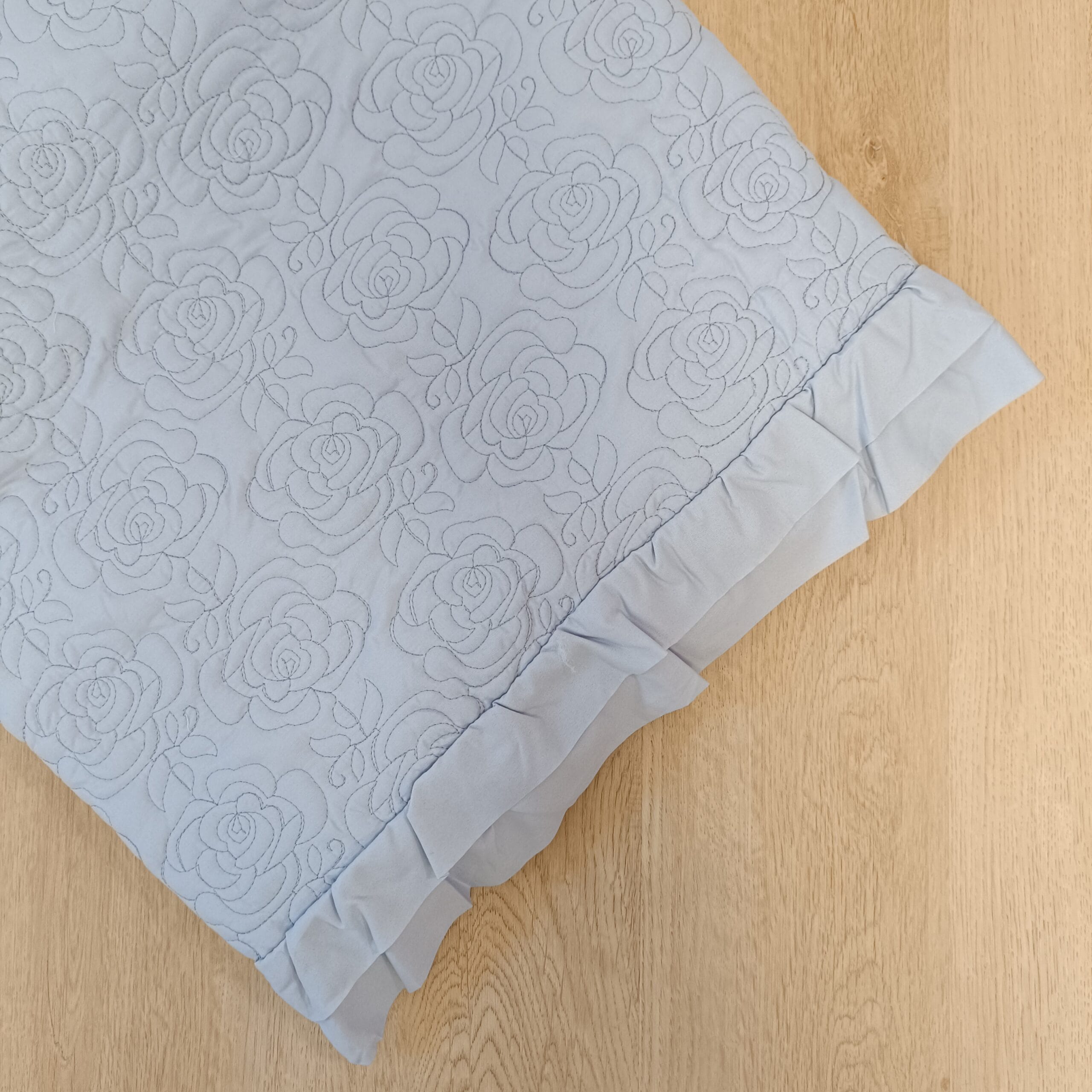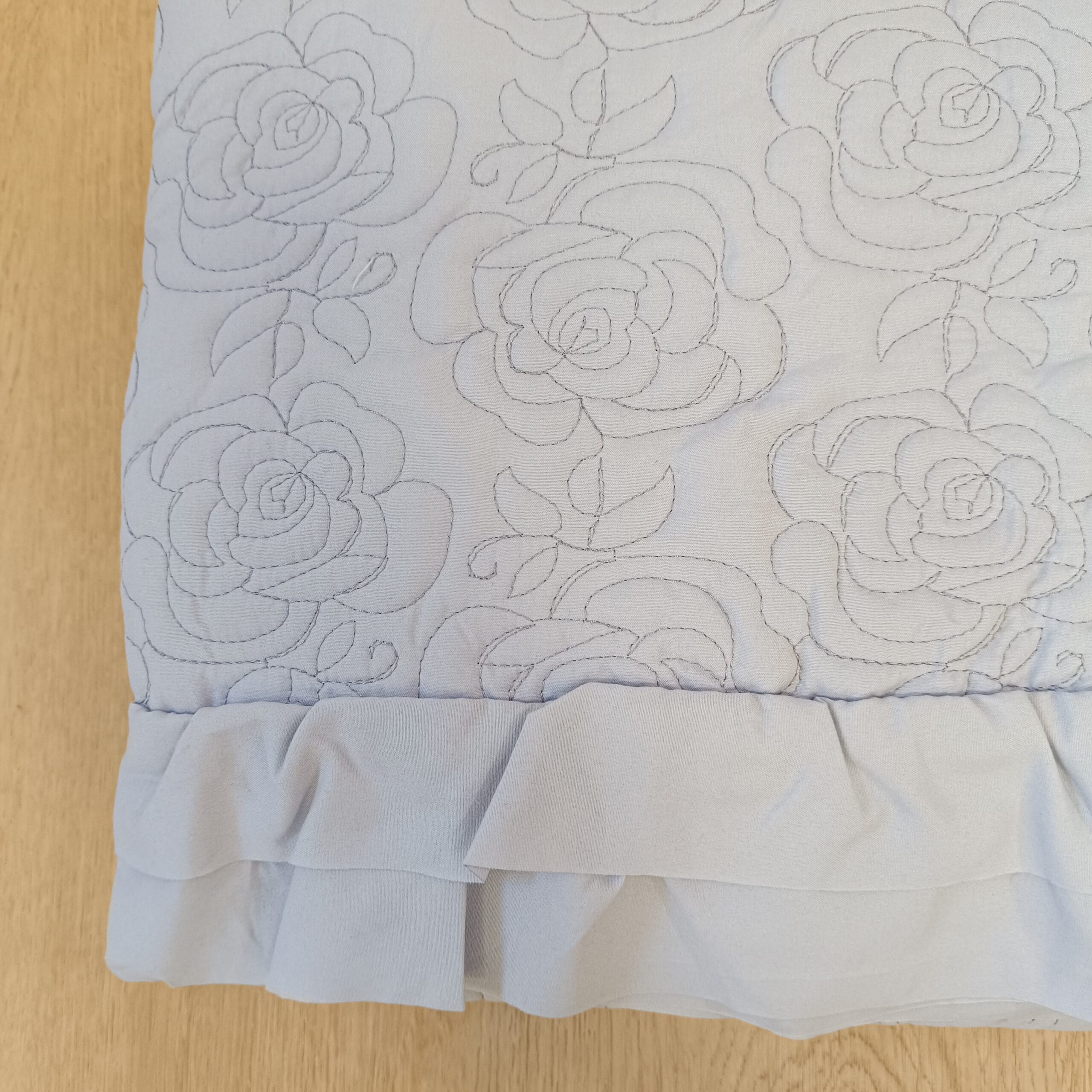 Copriletto trapuntato Matrimoniale “Elora”, leggero e fresco perfetto per la Primavera/Estate in tinta unita di colore lilla chiaro con ricamanto delle rose e un elegante volant, offre morbidezza e comfort per ogni notte.