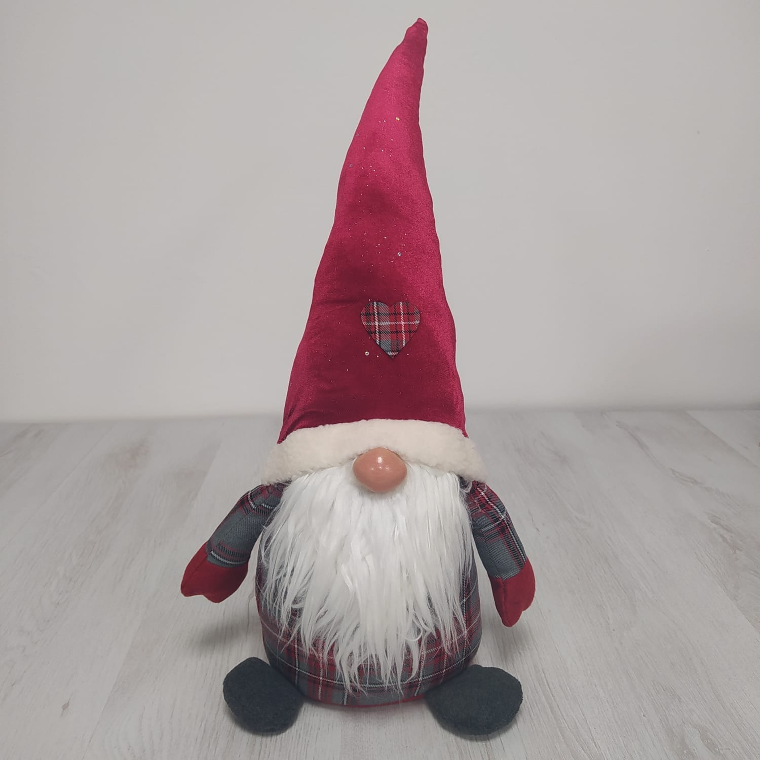 Gnomo Natalizio in Tartan Rosso Nordic, utile come fermaporta grazie all’imbottitura in sabbia che lo rende stabile o come decorazione per la tua casa per portare l’atmosfera di Natale; ideale anche come idea regalo.