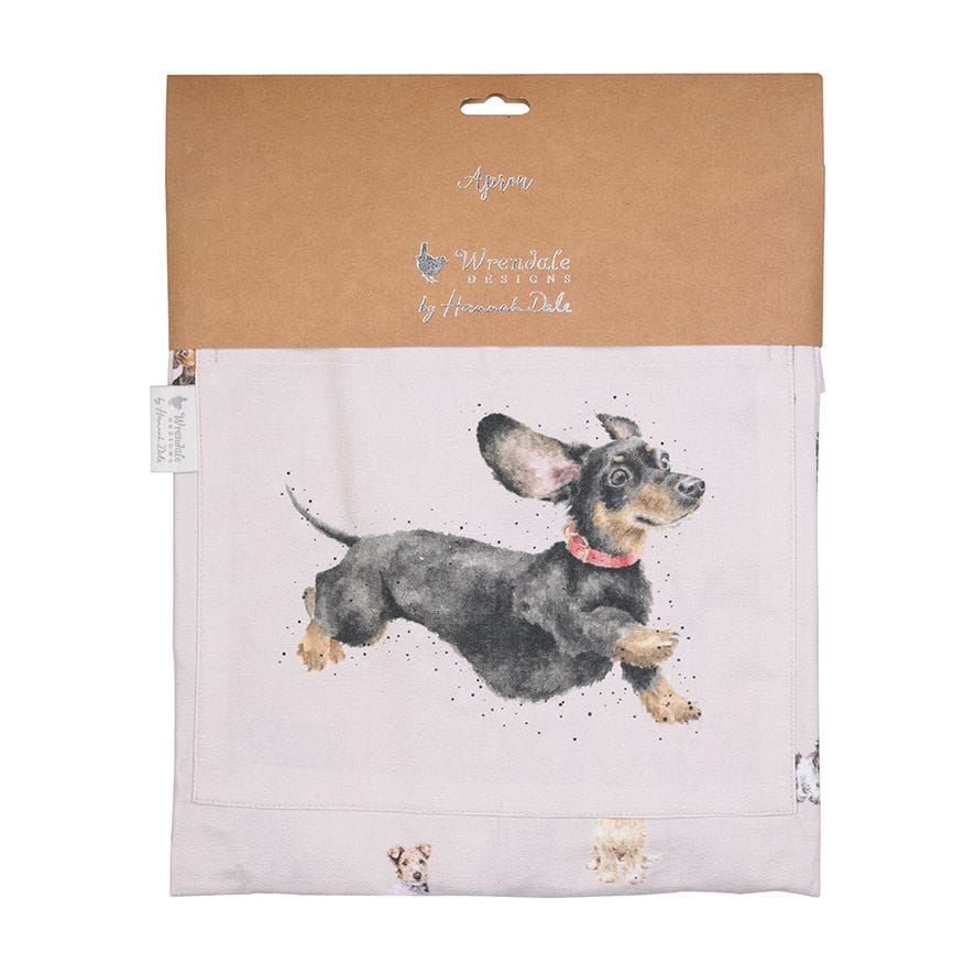 Grembiule Cucina tessuto 100% Cotone con stampa tutto su sfondo color Fango e con fantasia di tanti piccoli Cani e un bellissimo Bassotto sulla tasca anteriore, perfetta per riporre i tuoi oggetti essenziali mentre sei in cucina. Il passante per il collo e le spalline in colore a contrasto sono regolabili. Lavabile in Lavatrice a 30°.