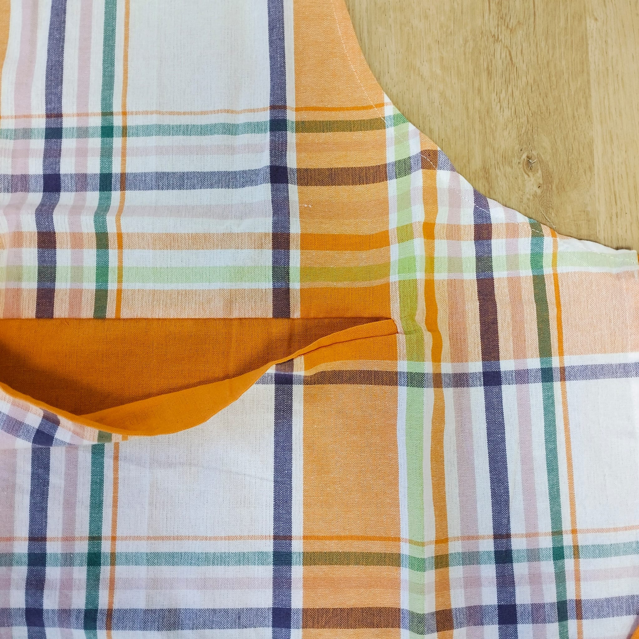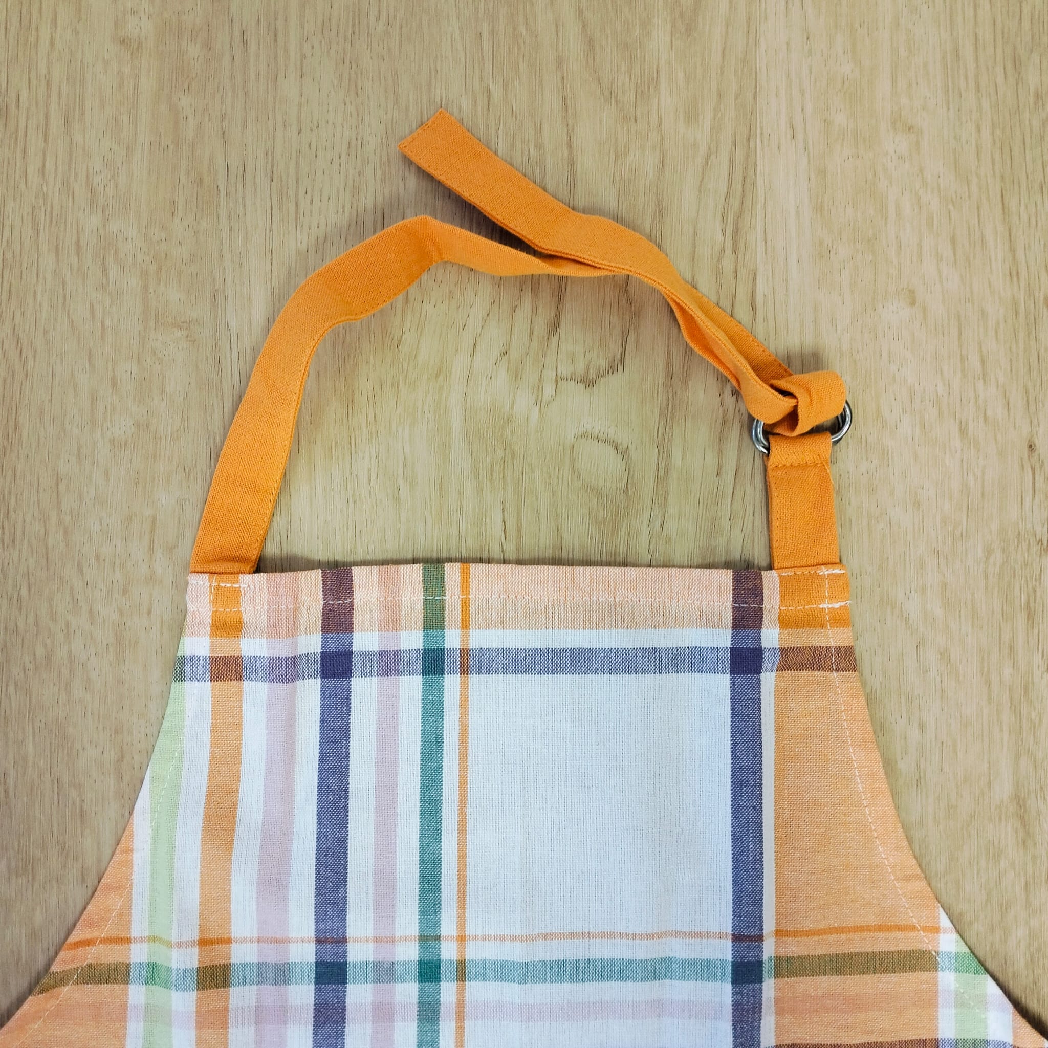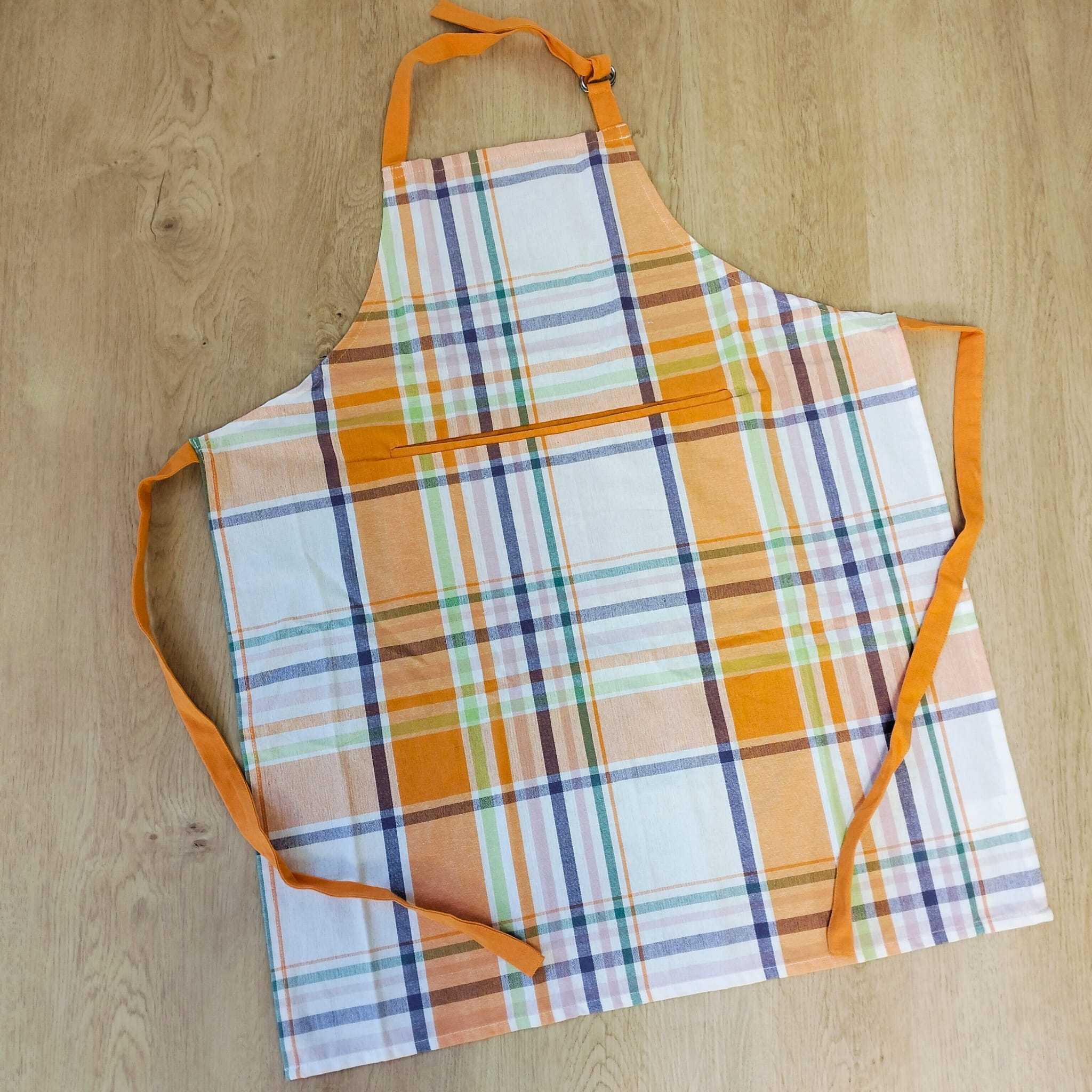 Dai un tocco di colore alla tua cucina con il Grembiule in tessuto 100% Cotone tinto in filo, fantasia a quandretti arancio con tasca e tacci. In abbinato ci sono gli strofinacci e la tovaglia con la stessa fantasia.