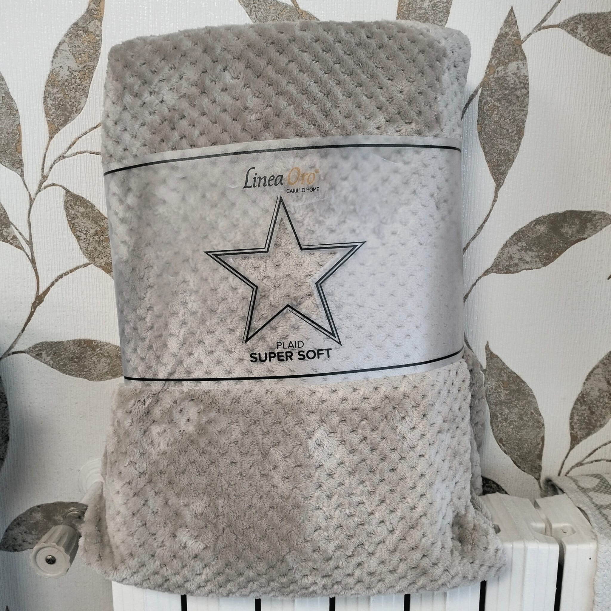 Plaid in Pile in Ecopelliccia di colore Grigio Chiaro con l’interno in sherpa agnellato dello stesso colore, perfetto per l’inverno super caldo, morbido e avvolgente.Lavabile in lavatrice a 30°.