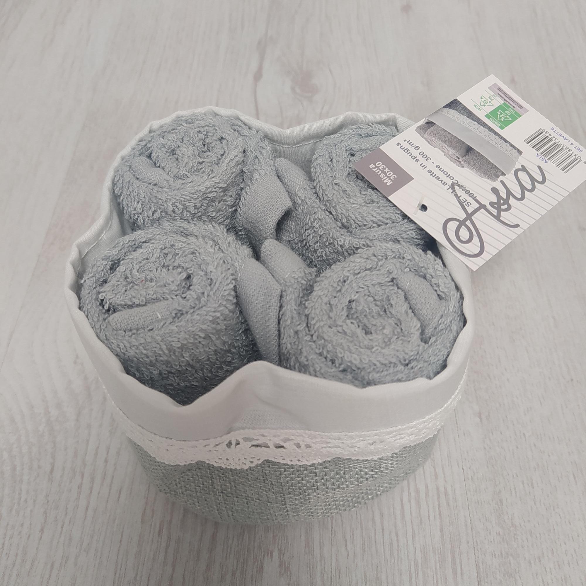 Cestino con 4 Lavette da bagno in morbido tessuto spugna 100% Cotone da 400gr, di colore Grigio, ideale per un’asciugatura delicata e comfort quotidiano. Pratico ed elegente, il cestino offre una soluzione ordinata e stilosa al tuo bagno.