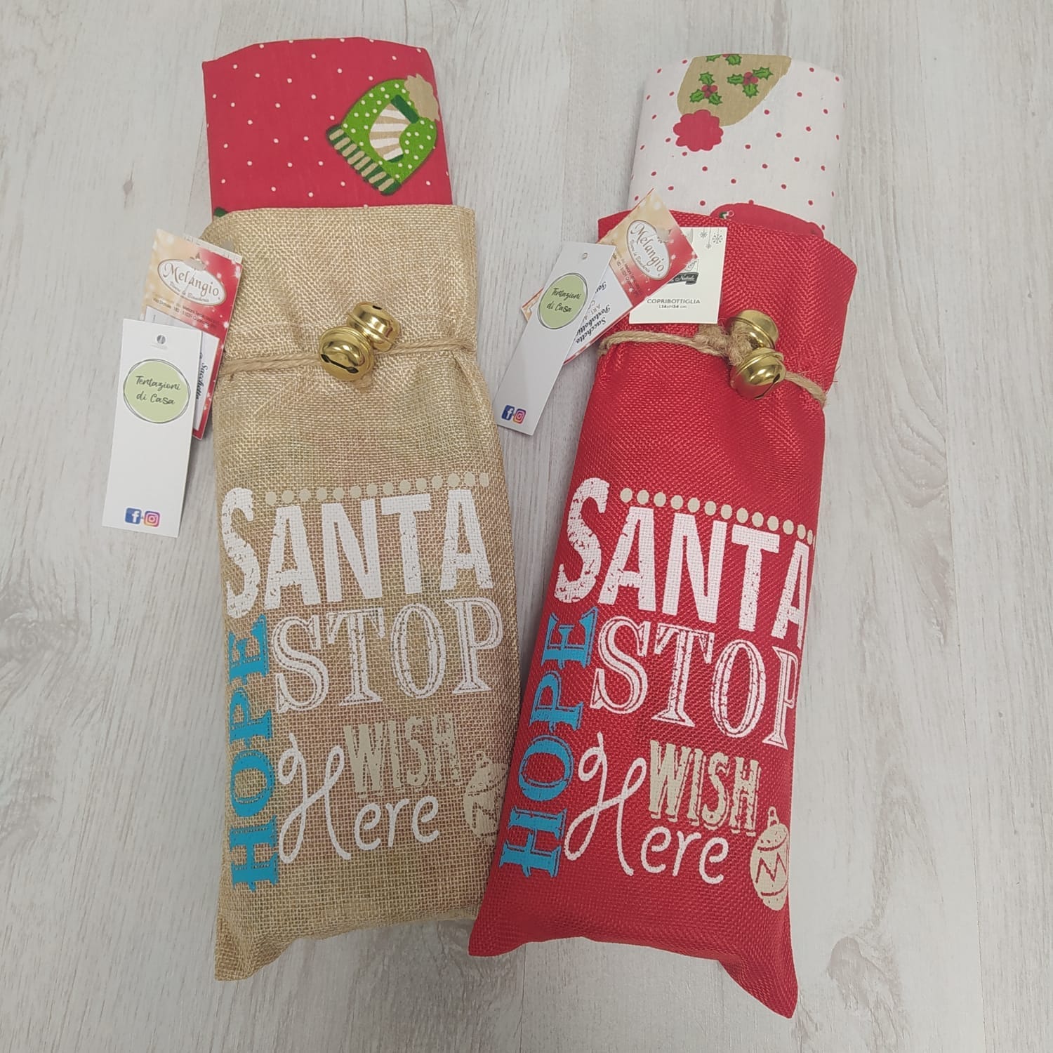Copribottiglia in Juta Rossa con scritta più Tovaglia Natalizia Bianca con fantasia Christmas in tessuto 100% Cotone,