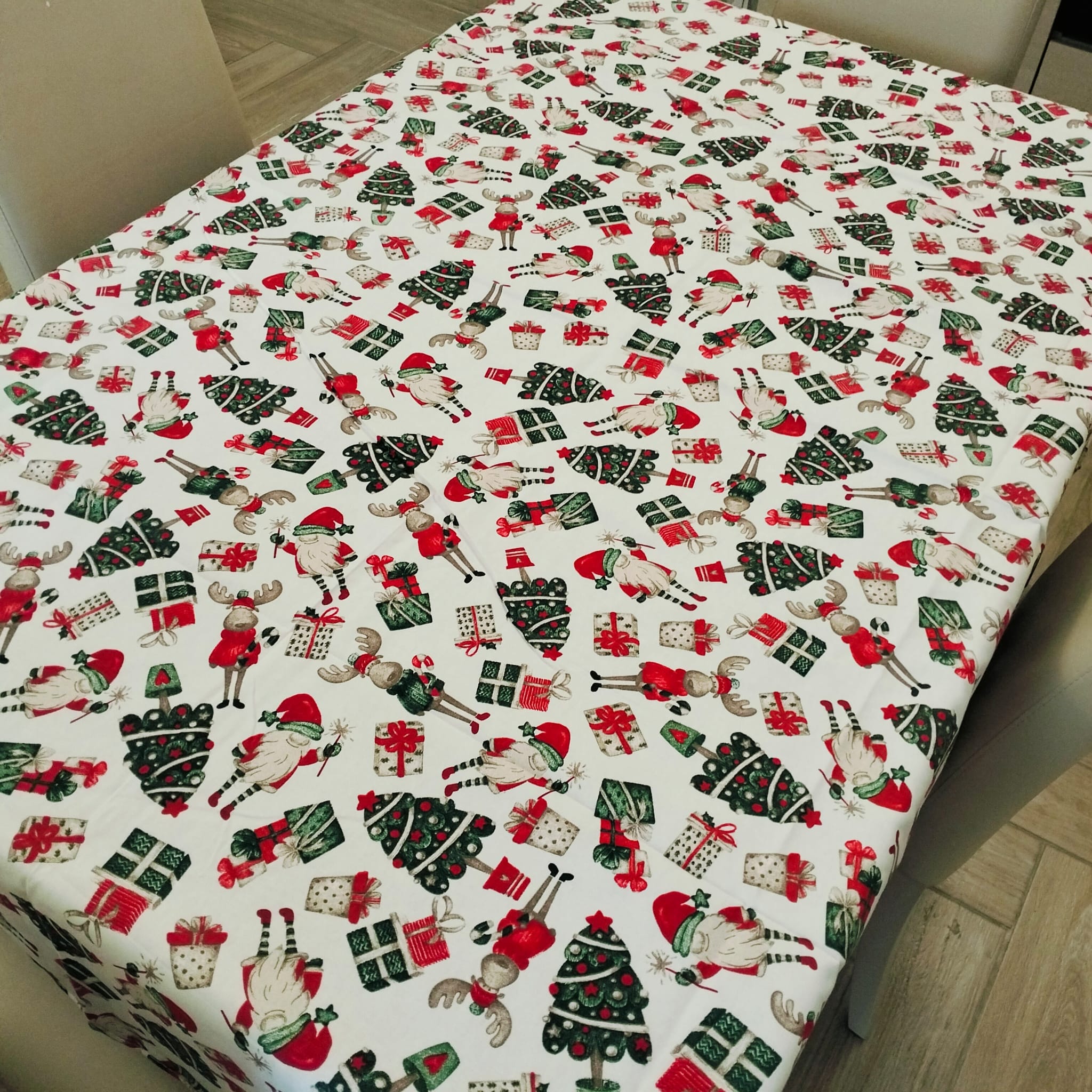 Tovaglia Natale con fantasia babbo natale, renna, pacchi regalo, albero di natale su sfondo bianco, tessuto 100% Cotone, lavabile in lavatrice a 30°.Aggiungi un tocco di allegrai e tradizione alla tua tavola, perfetta per le feste o per pranzi e cene di famiglia, questa tovaglia renderà ogni momento insieme ancora più speciale.