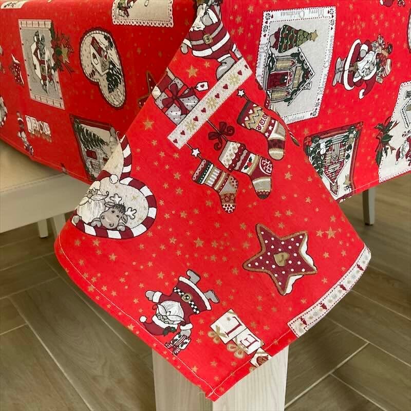 Tovaglia Natalizia Noel con fantasia Babbo Natale su sfondo Rosso, tessuto 100% Cotone, lavabile in lavatrice a 30°.